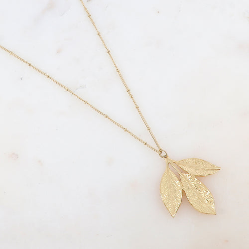 COLLIER Dame Sautoir acier inoxydable doré feuille et perle