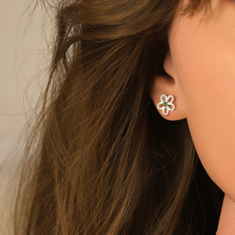 BOUCLES D'OREILLES Dame fleur +pierre verte ARGENT