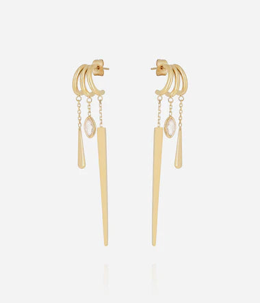 Boucles d’oreilles formée de 3 demies créoles portant chacune une chainette avec un zirconium ovale, un triangle allongé en acier et une goutte allongée en acier.