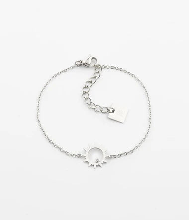Bracelet chaînette en acier uni ou doré à l'or fin arborant un motif de cercle à petits picots avec un zirconium en son centre.