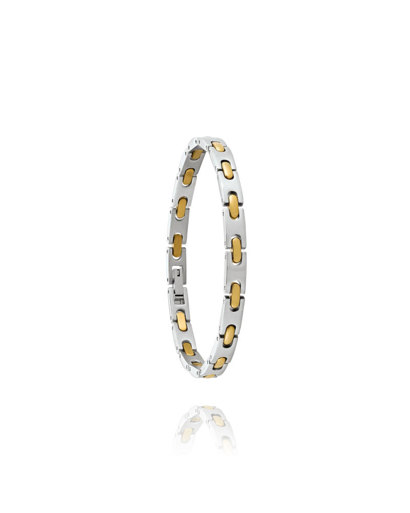 Vous aimez vous démarquer ? Vous aimerez porter le bracelet DINEMA, avec maillons en acier et charnières en acier noir. Un bijou homme au look contrasté pour forte personnalité. En acier argenté et doré. Longueur : ajustable 19,5 à 21 cm - Fermoir : Cliquet
