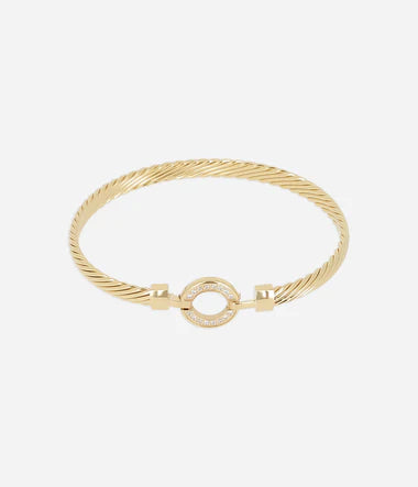 Bracelet jonc fin en acier inoxydable uni ou doré à l’or fin par ionisation. Le jonc est torsadé et est composé d'un anneau serti de zirconiums qui fait office fermoir grâce à un petit crochet.