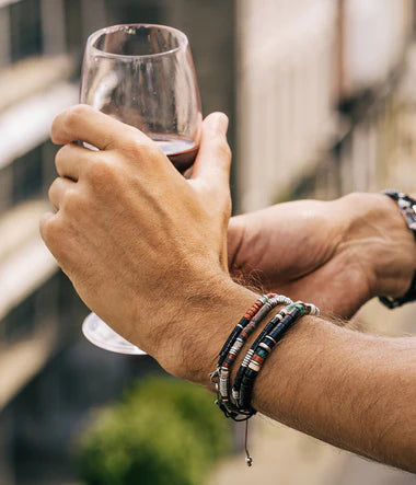 Bracelet ajustable sur lequel sont enfilées des pierres colorées. Ce bracelet a beaucoup de fraîcheur et reste très lumineux sur le bras.
