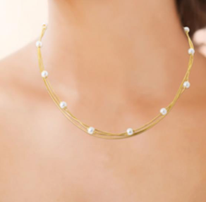 COLLIER Dame ACIER DORE 3 rangs et perles blanches