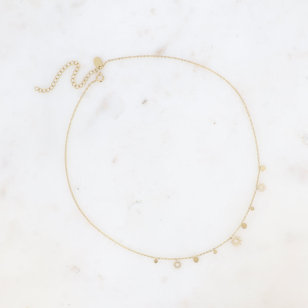 Collier sur chaîne en acier inoxydable doré composé de pastilles rondes plates et de pampilles soleil ajouré.