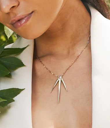 • Collier en acier inoxydable doré à l'or fin par ionisation serti d'un pendentif composé de 3 pointes en haut desquelles se trouve un zirconium ovale.