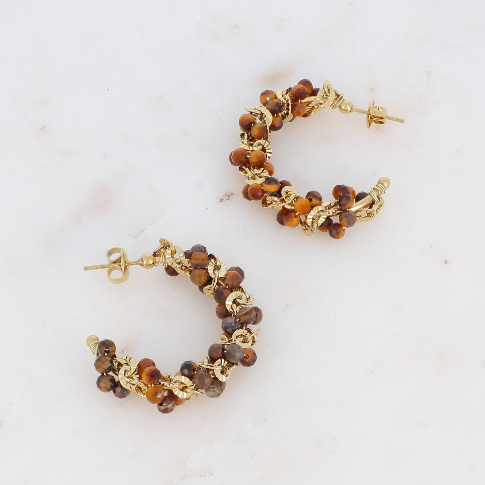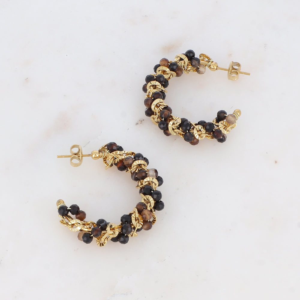 Boucles d'oreilles de type créoles à puce composées de perles en pierre naturelle AGATE NOIE OU OEIL DE TOIGRE et d'une maille. Fermoir papillon. Matière : Acier inoxydable. Hypoallergénique, ce bijou résiste à l'eau et ne noircit pas. Diamètre:: 3,4 cm.