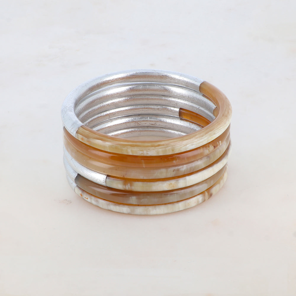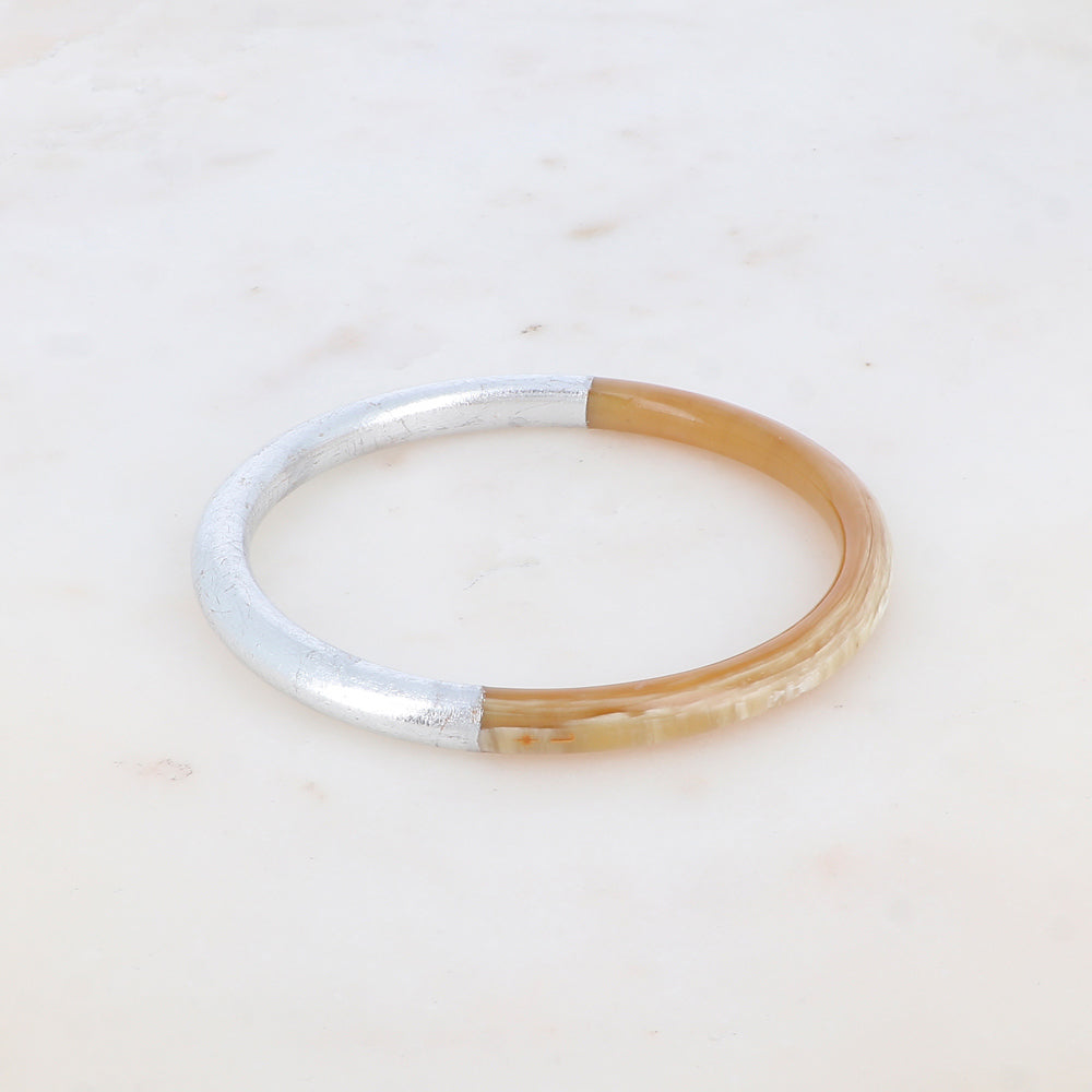 Chaque jonc est une pièce unique, la couleur de la corne naturelle peut varier et ne sera donc pas forcément identique à celle de la photo. Les nuances sont variables (beige, blanc, gris ou noir )