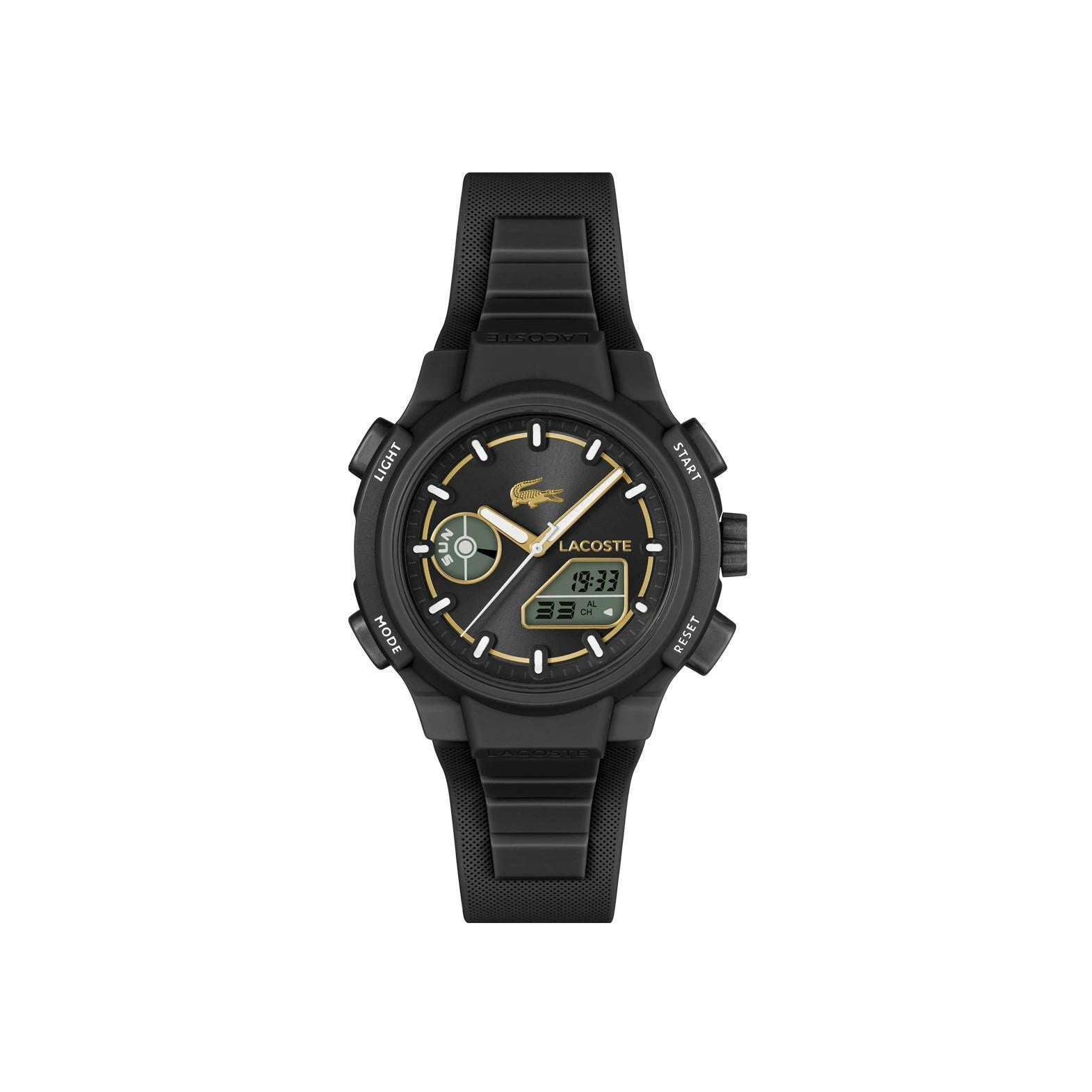 Couleur Noir et doré Garantie 2 ans Type de garantie Internationale Diamètre du boitier 40,00 mm Epaisseur du boitier 14,50 mm Forme du boitier Rond Matière du boitier Acier inoxydable , Plastique Finition du cadran Soleillée Couleurs Cadran Noir Fond de la montre Fond maintenu par des vis Forme du verre Plat Qualité du verre Verre minéral Boutons 1 bouton remontoir , 4 boutons poussoirs Mouvements Quartz Complications Quantième Date , Jour , Mois Fonction chronographe Oui Complications Chronographe Chronomètre - 24 heures , Chronomètre au 1/100e Alarme Oui Caractéristiques techniques spécifiques Rétroéclairage Type d'affichage Analogique (aiguilles) , Numérique (digital) Spécificités de l'affichage Aiguilles et index luminescents , Eclairage nocturne , Index et chemin de fer , LCD Fonctions Chronographe , Heures, minutes, secondes, dates, jours, mois , Réveil Etanchéité 10 atmosphères Matière du bracelet Silicone Couleur du bracelet Noir Finition matière du bracelet Gaufré , Micro Perforé