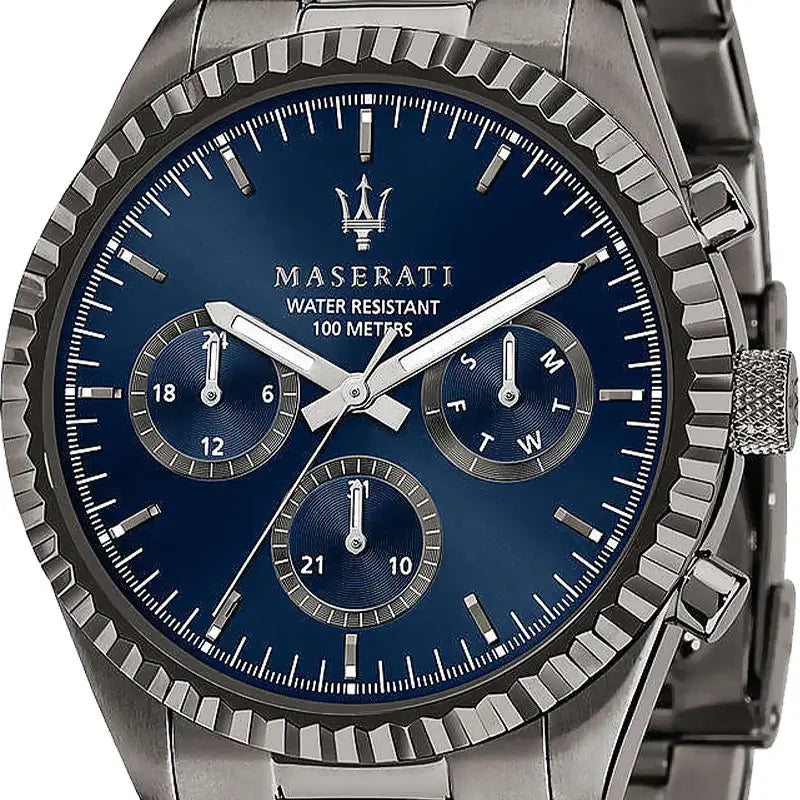 GARANTIE 2 ans TYPE DE GARANTIE Internationale DIAMÈTRE DU BOITIER 43,00 mm EPAISSEUR DU BOITIER 11,50 mm FORME DU BOITIER Rond MATIÈRE DU BOITIER Acier inoxydable , PVD gris LUNETTE Effet cannelé FINITION DU CADRAN Soleillée COULEURS CADRAN Bleu FOND DE LA MONTRE Fond vissé FORME DU VERRE Plat QUALITÉ DU VERRE Verre minéral BOUTONS 1 bouton remontoir , 2 boutons poussoirs MOUVEMENTS Quartz TYPE DE MÉCANISME Mecanisme japonais MARQUE DE MOUVEMENT Seiko Corp. CALIBRES (MOUVEMENTS) Seiko VX9J FONCTION CHRONOGRAPHE Oui COMPLICATIONS COMPTEUR 24 h , Date , Jour TYPE D'AFFICHAGE Analogique (aiguilles) SPÉCIFICITÉS DE L'AFFICHAGE Aiguilles et index luminescents , Chiffres arabes , Index et chemin de fer NOMBRE DE COMPTEURS (ADDITIONNEL) 3 FONCTIONS Heures, minutes, secondes, dates, jours ETANCHEITÉ 10 atmosphères MATIÈRE DU BRACELET Acier inoxydable COULEUR DU BRACELET Gris FERMOIR MONTRE Boucle déployante simple COULEUR FERMOIR Gris